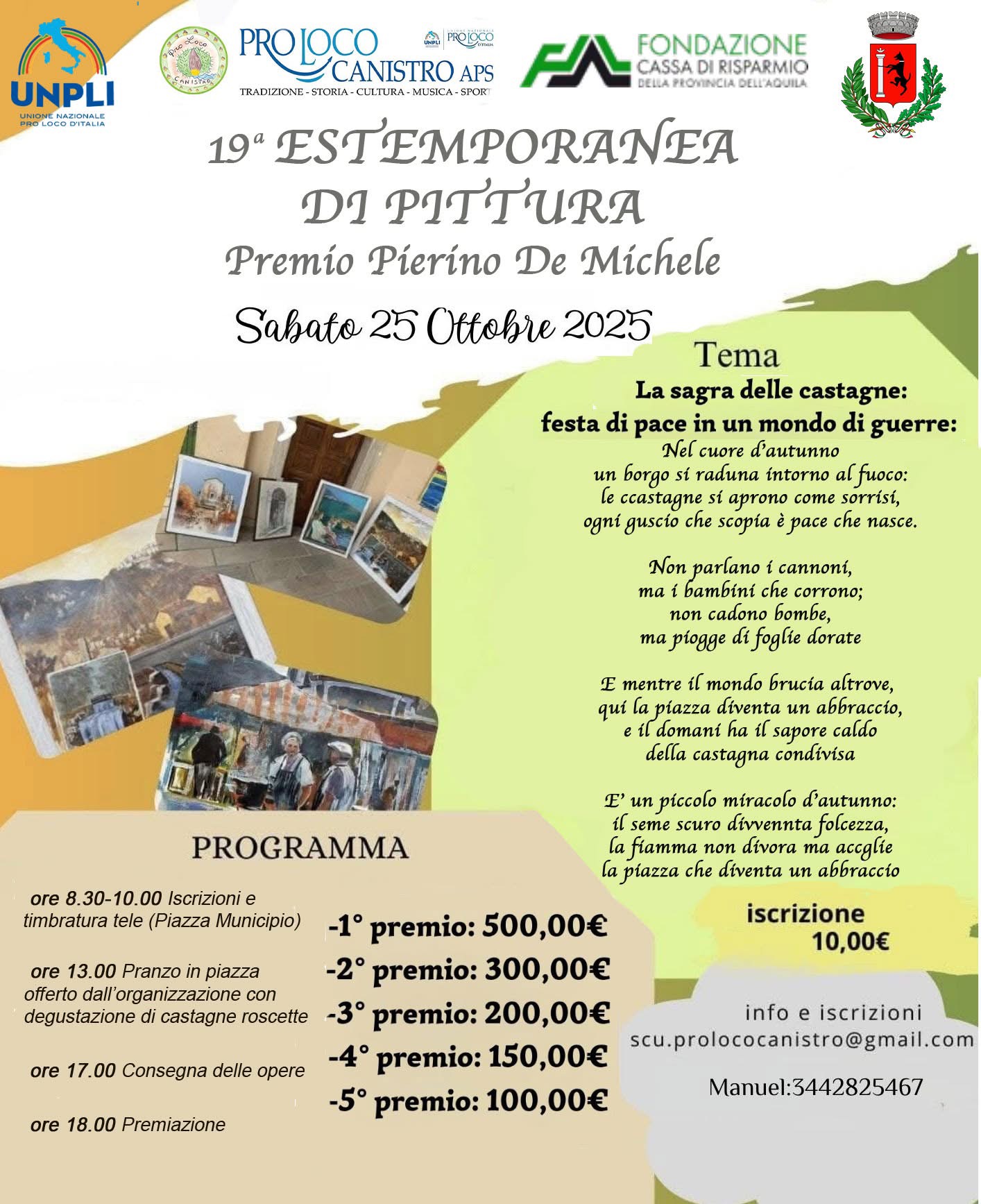La comunità di Canistro si prepara ad accogliere artisti e appassionati per il XIX Concorso di Pittura Estemporanea "Premio Pierino De Michele", in programma sabato 25 ottobre 2025.