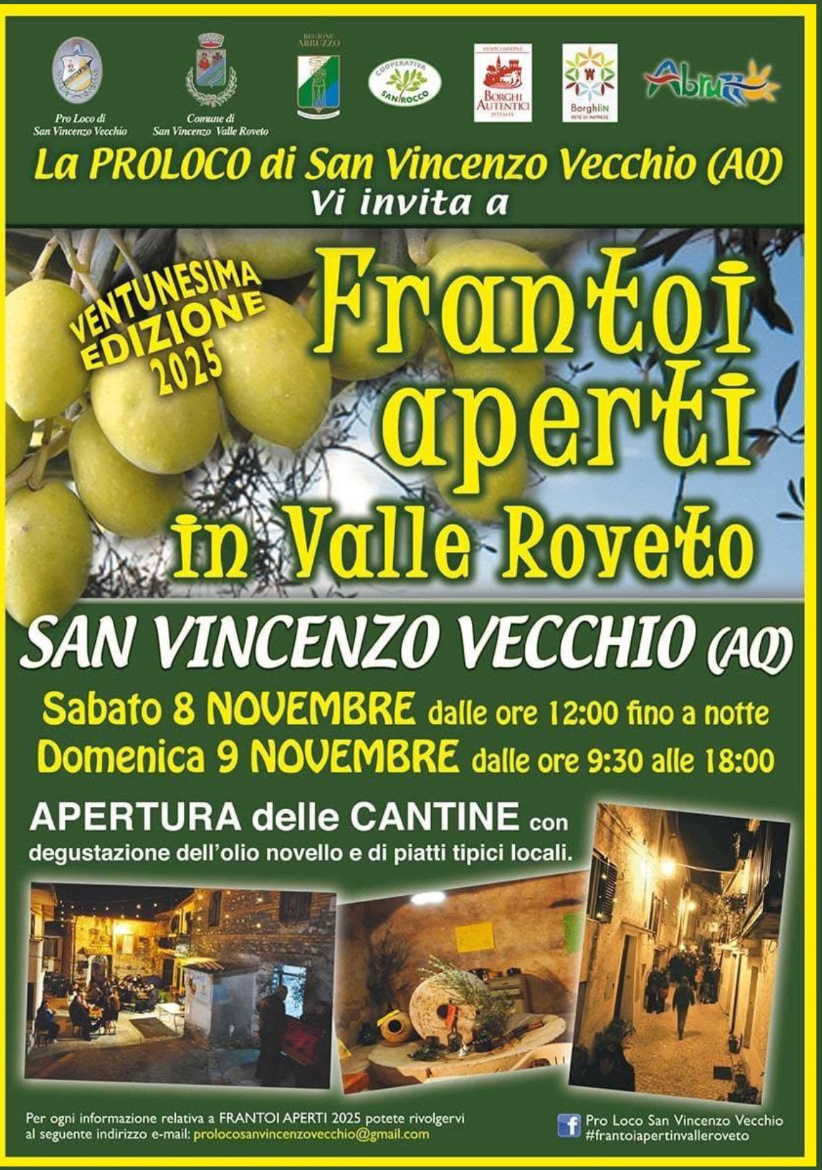 La 21a edizione di Frantoi Aperti in Valle Roveto si svolgerà sabato 8 e domenica 9 novembre nell'autentico borgo di San Vincenzo Vecchio, con le Cantine Aperte nel centro storico. Saranno disponibili degustazioni di olio nuovo e prodotti tipici. Per maggiori informazioni su Frantoi Aperti 2025, si prega di contattare la Pro Loco all'indirizzo prolocosanvincenzovecchio@gmail.com